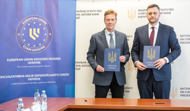 On 20 March in Kyiv, the European Union Advisory Mission (EUAM) Ukraine and the National Agency on Corruption Prevention (NACP) signed a Working Arrangement, expanding their cooperation on strengthening integrity and preventing corruption across Ukraine’s civilian security sector.