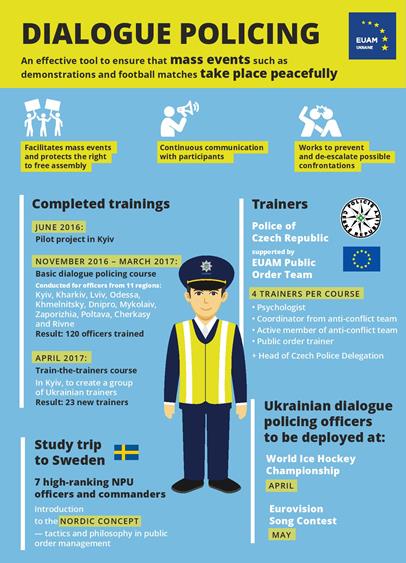 “Police officers must always consider the dialogue policing approach,” said Kestutis Lancinskas, Head of EUAM. “This technique not only facilitates the prevention of violence during large gatherings of people such as demonstrations or football matches. It allows police to get closer to the people they serve and become more trusted by them, and ensure greater transparency.”