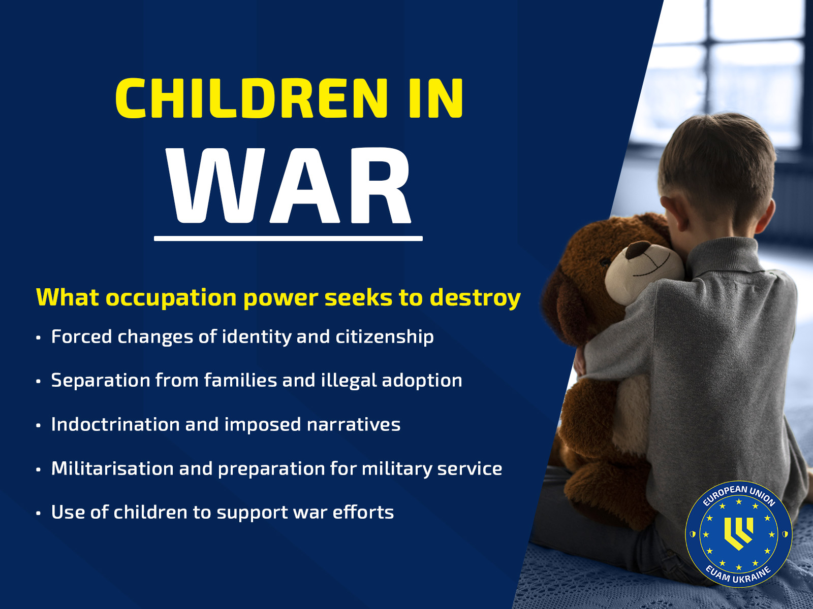 As Olha Matskiv, EUAM Legal Advisor, notes: “Turning Ukrainian children into soldiers and erasing their identity is not just a moral outrage – it is a crime that our legal system must learn to name and to prosecute. Our task as lawyers is to close legal gap, so that every attempt to weaponise Ukrainian childhood is clearly recognised and punished as a grave breach of international and national law.”